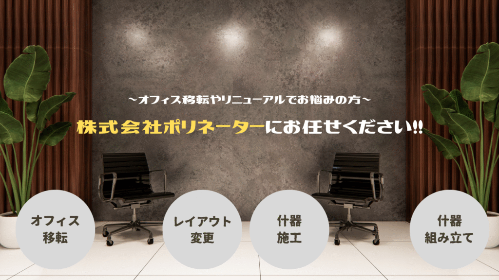 当社は オフィス移転の総合管理 をメイン業務とし、企業様のスムーズな移転をトータルでサポートしています。移転計画の立案からレイアウト変更、什器の買取・廃棄、さらにはオフィス什器の販売や施工に至るまで、一貫したサービスをご提供。